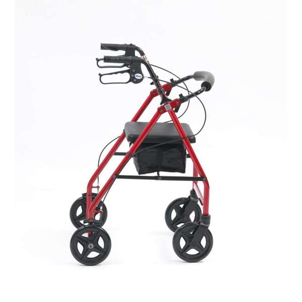 This rollator model has a rustproof and robust aluminium frame. It features looped cable brakes and a curved and padded backrest for comfort. Swivelling front wheels increase manoeuvrability, while the padded seat flips up easily for access to storage bag or for folding.