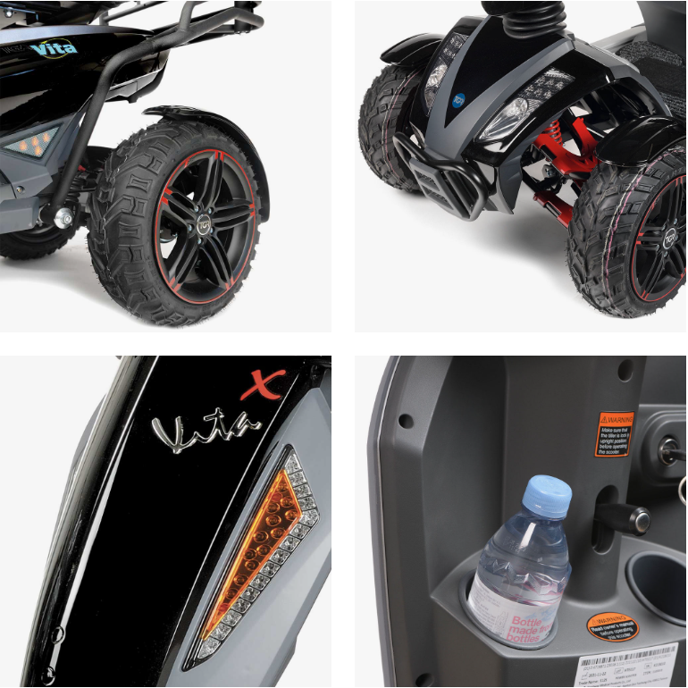 Take on any terrain with the Vita X mobility scooter. Able to handle all you can throw at it, off road or on. A powerful motor, dependable batteries, capable suspension and chunky tyres give the confidence you need, to get you where you want to go.